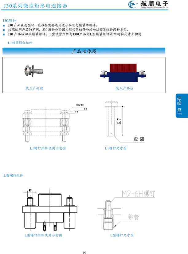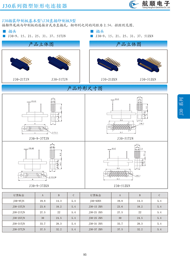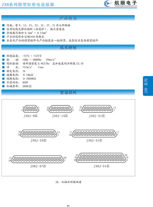 符合GJB2446《外殼定位超小型矩形電連接器總規(guī)范》(相當(dāng)于美軍標(biāo)MIL-C-83513),可與美國MDM系列產(chǎn)品和國內(nèi)同類產(chǎn)品互換,在J30系列產(chǎn)品的基礎(chǔ)上增 加了鋁合金外殼與各種鋁合金尾夾;采用絞線式插針 (俗稱麻花針),單個(gè)接觸件接觸點(diǎn)達(dá)七個(gè),提高了產(chǎn)品的接觸可靠性;采用1.27mm網(wǎng)格,接觸件密度大、體積小、重量輕;現(xiàn)有9、15、21、25、31、37、51、66、74、100芯共十種型譜可供選用;適用導(dǎo)線線芯 截面積為0.07~0.15mm2,尾端可以根據(jù)用戶要求進(jìn)行 布線;本產(chǎn)品的鎖緊組件按與產(chǎn)品組裝在一起提供,如不需鎖緊組件請?jiān)诤贤凶⒚?;本系列產(chǎn)品滿足GJB2446《外殼定位超小型矩形電連接器總規(guī)范》的 要求;本系列產(chǎn)品的執(zhí)行標(biāo)準(zhǔn)如下:Q/ZHDZ GC-18《J30J系列微矩形電連接器詳細(xì)規(guī)范》。